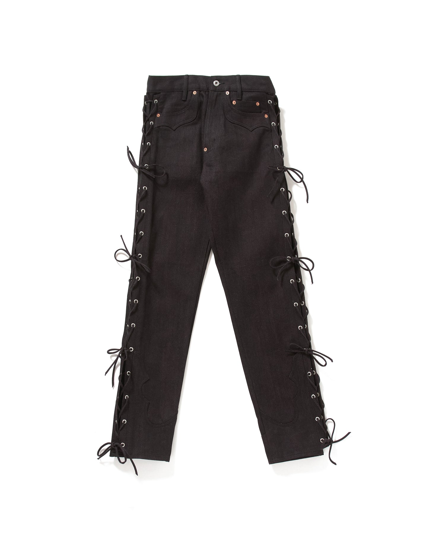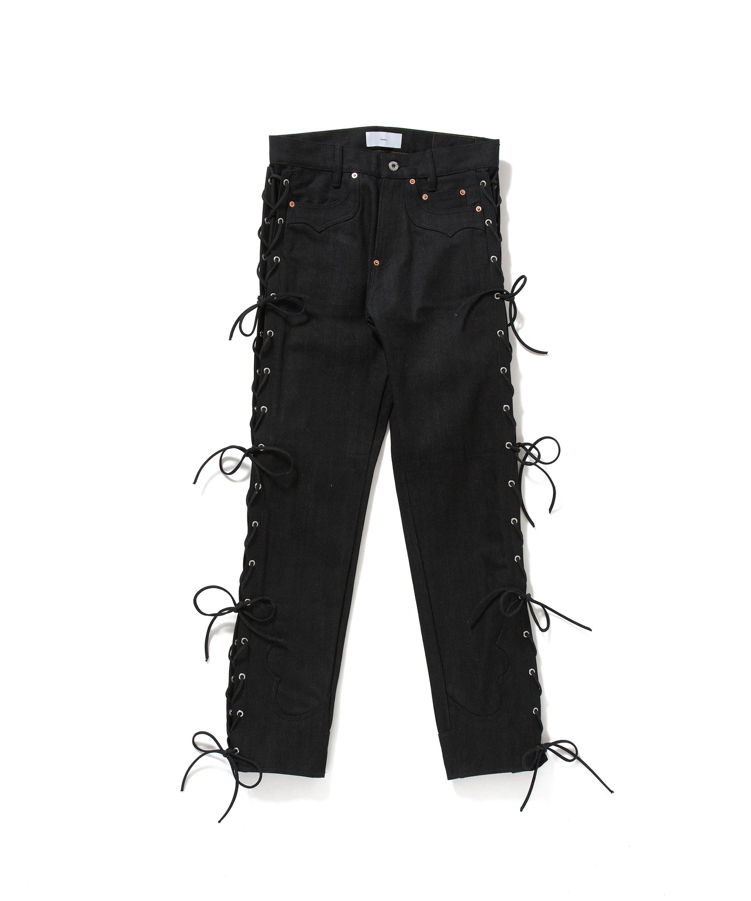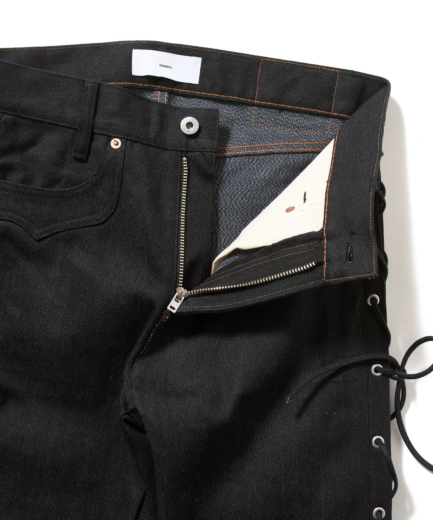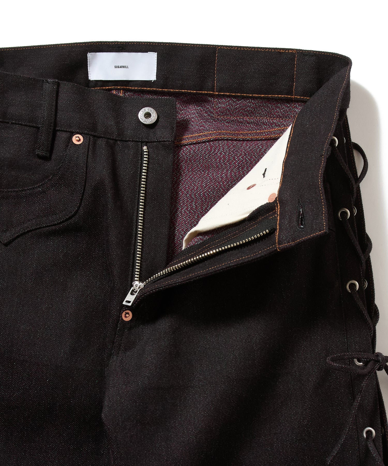 バイカースタイルをベースにしたデニムパンツ。両サイドに施したドローコードのディテールが存在感を放ち、生地特有のハードな質感が全体を引き締めています。武骨さと装飾性を併せ持つ一本は、スタイリングの主役としても引き立ち、タフな空気感を損なわない仕上がりです。複数色の糸を重ねることで現れる霜降りのようなムラ感は、穿き込むほどに表情を増し、単調さとは無縁の奥深い風合いを楽しめます。