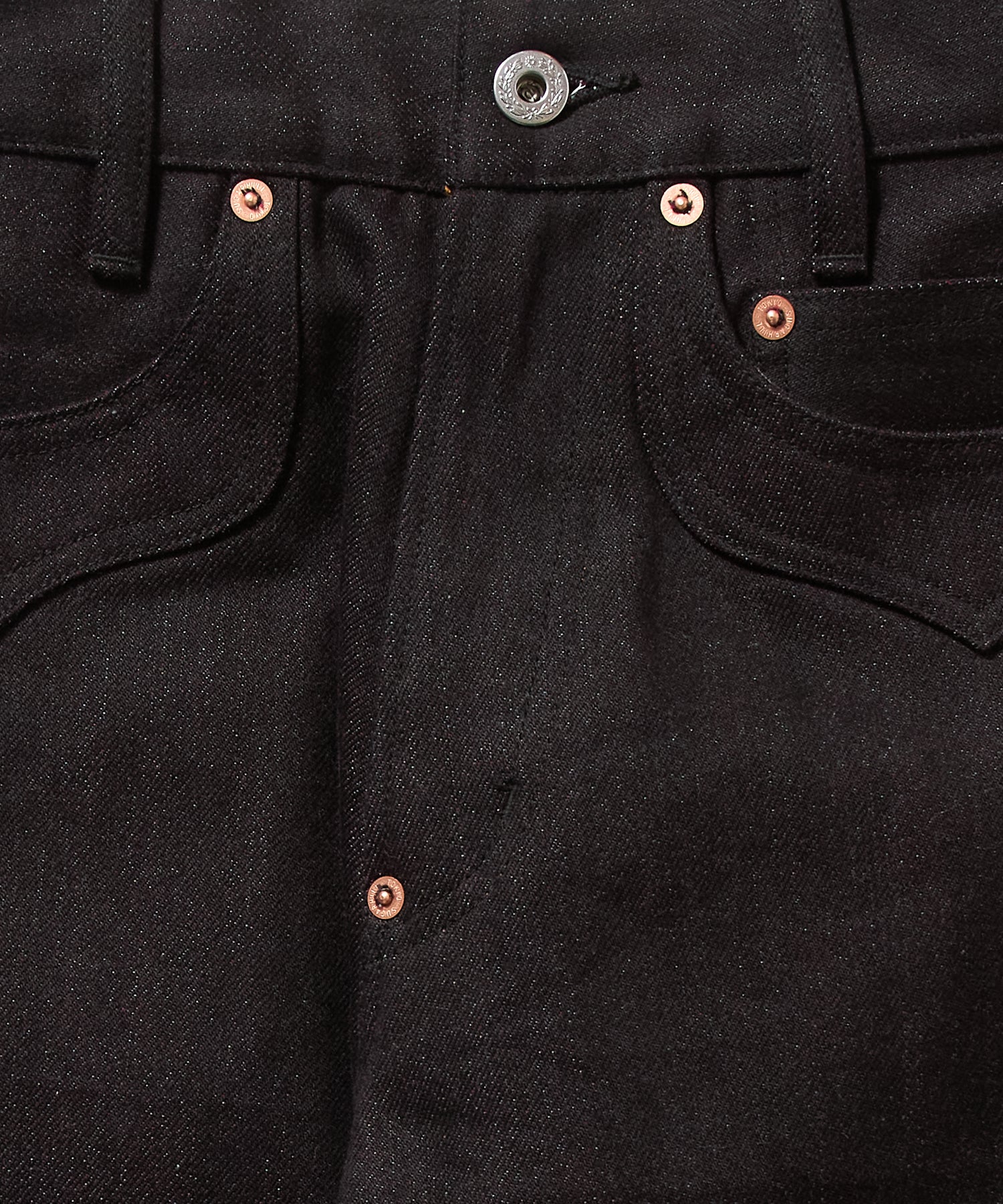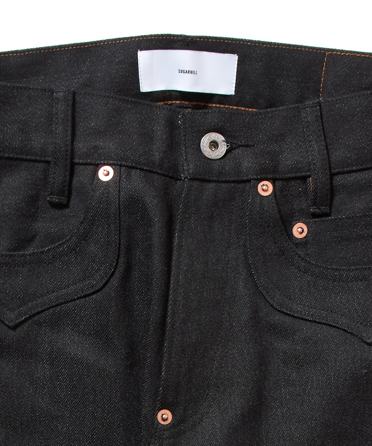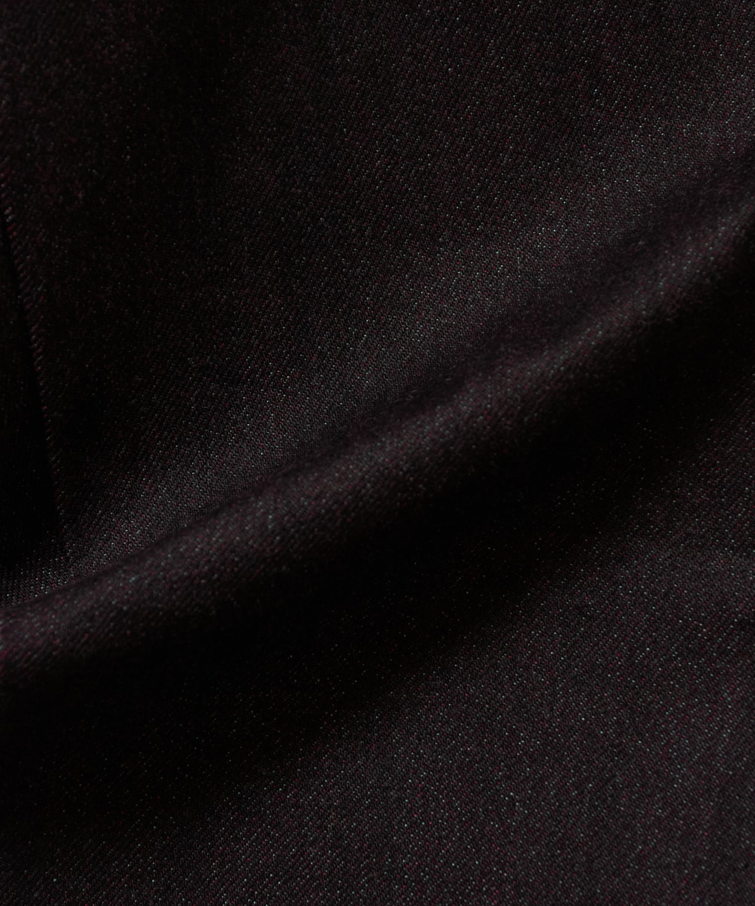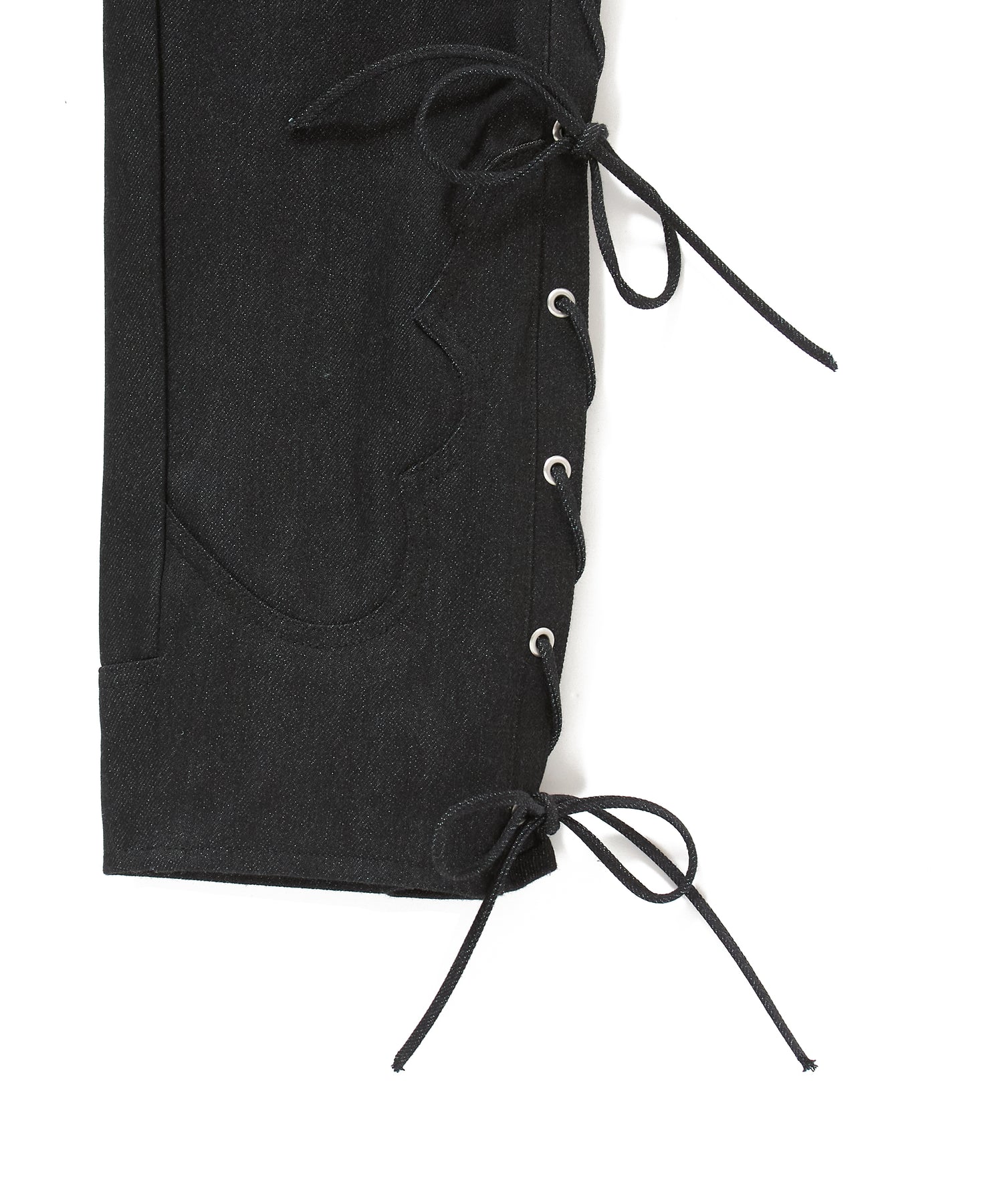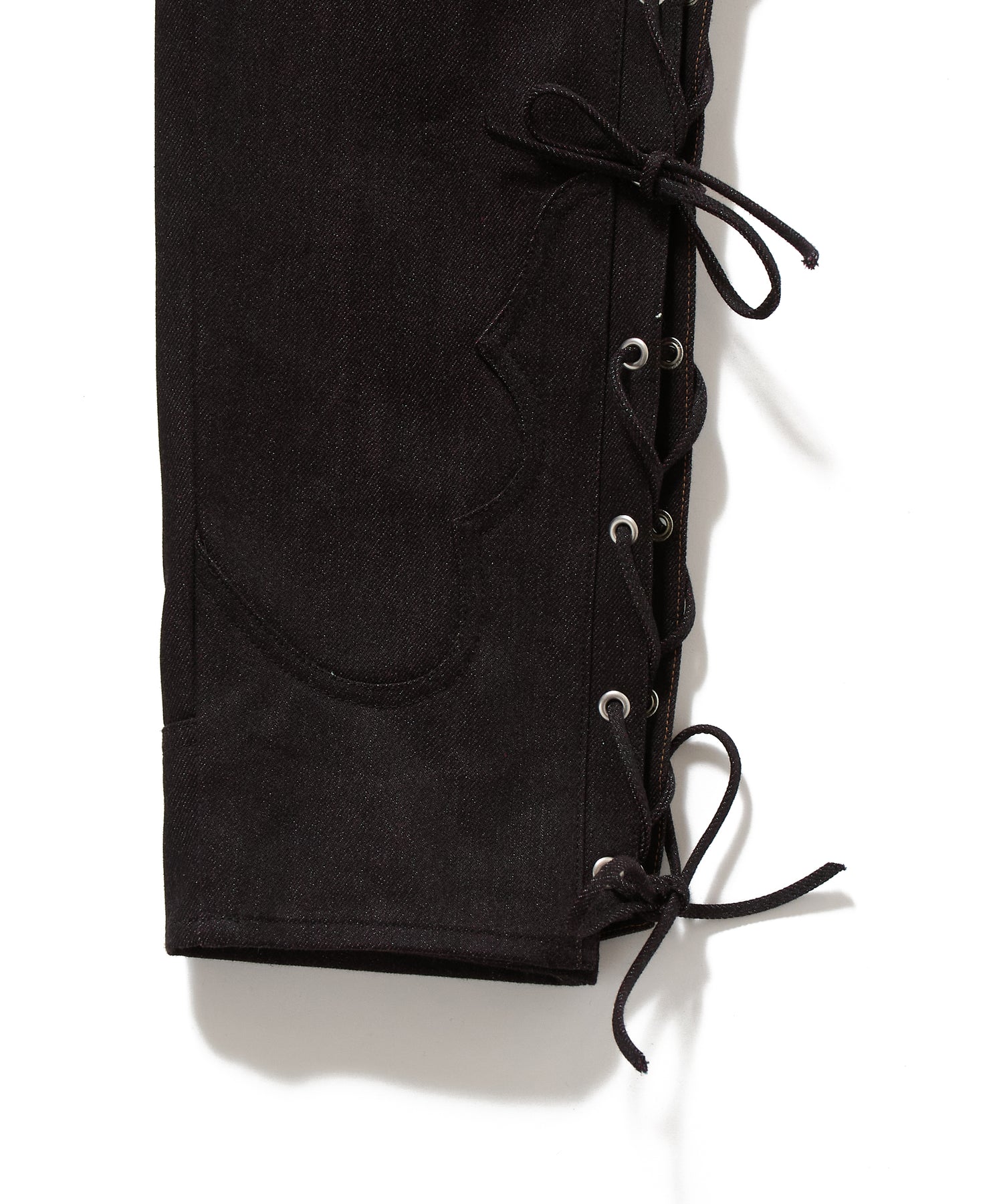 バイカースタイルをベースにしたデニムパンツ。両サイドに施したドローコードのディテールが存在感を放ち、生地特有のハードな質感が全体を引き締めています。武骨さと装飾性を併せ持つ一本は、スタイリングの主役としても引き立ち、タフな空気感を損なわない仕上がりです。複数色の糸を重ねることで現れる霜降りのようなムラ感は、穿き込むほどに表情を増し、単調さとは無縁の奥深い風合いを楽しめます。