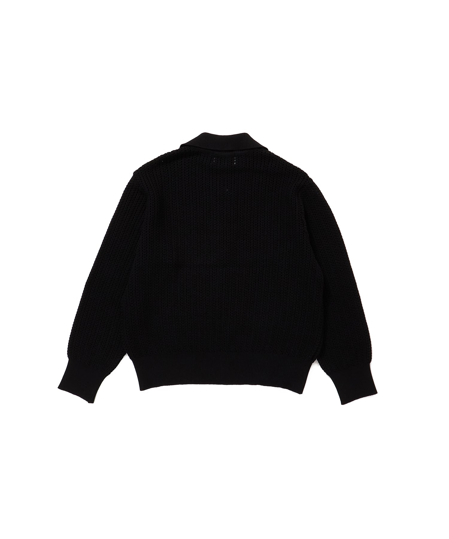 衿付きの仕様と、裾・袖口のリブ編みが全体のシルエットを整えています。