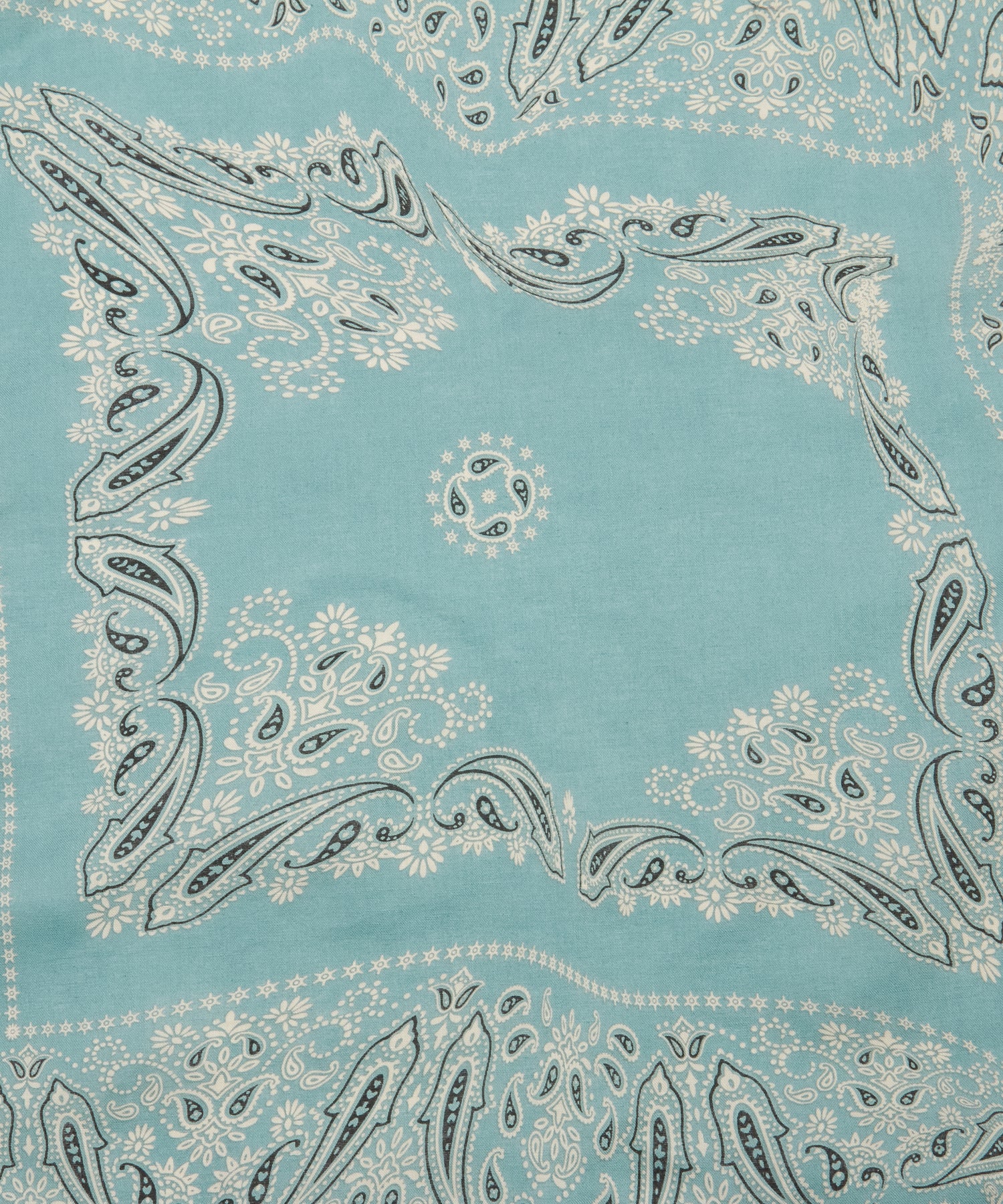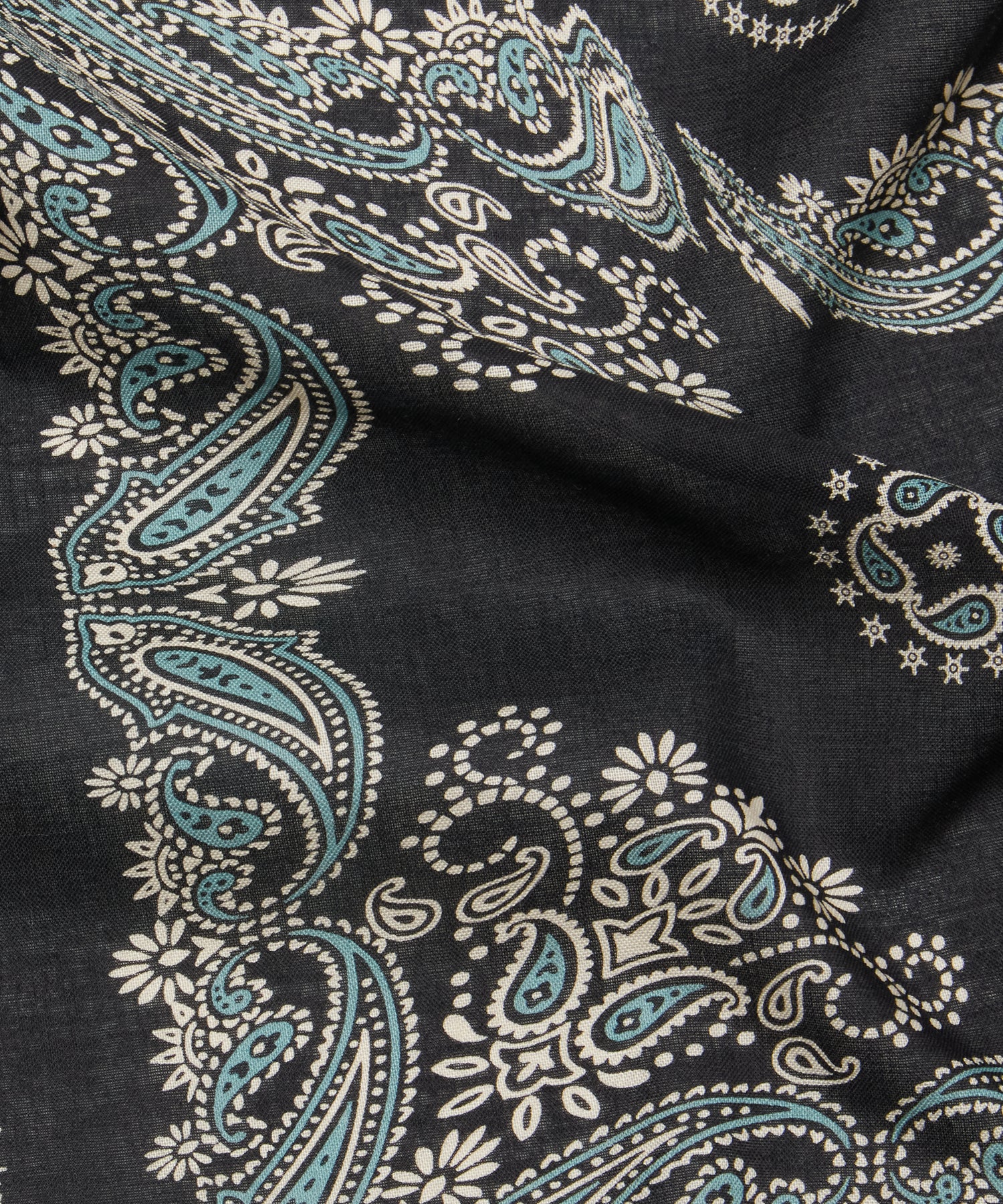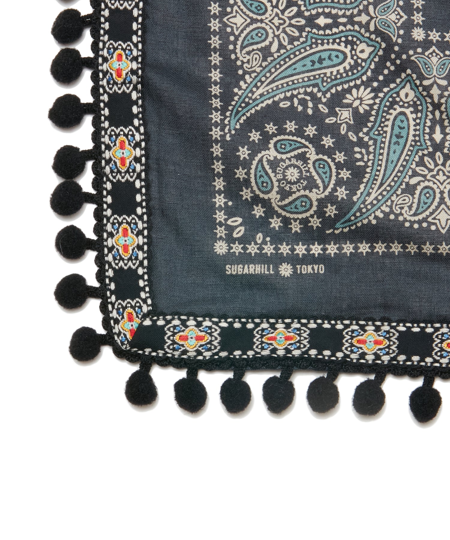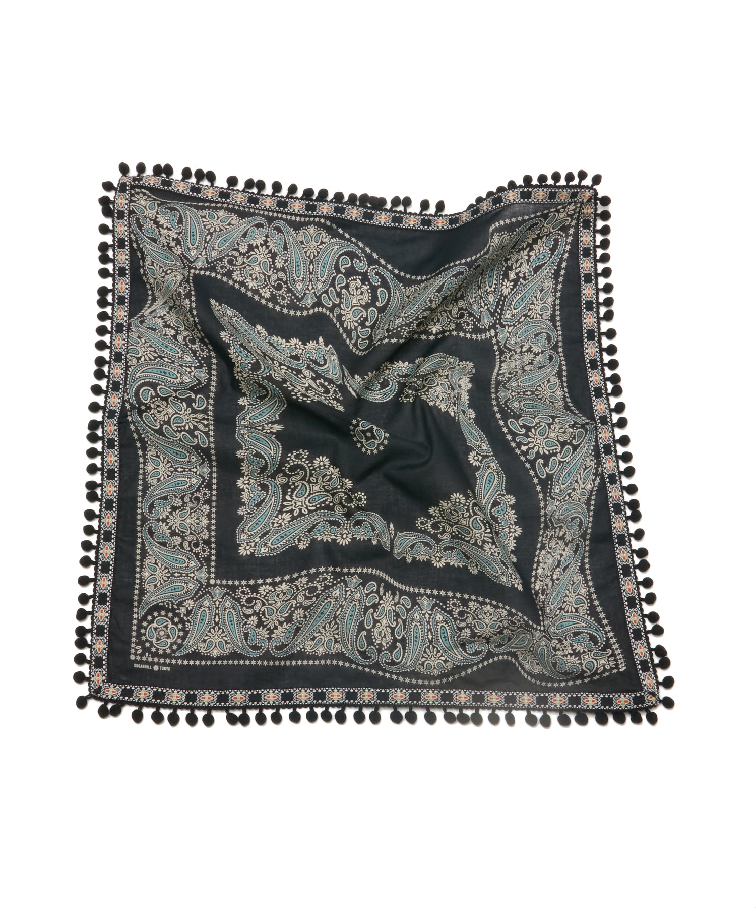 定番のバンダナに、動きのあるディテールをプラス。細かな柄のチロルテープを縁取りに用い、控えめながらも存在感を放ちます。首元に巻く、バッグに結ぶ、腰に垂らす。一枚で多彩な使い方が楽しめるアイテムです。