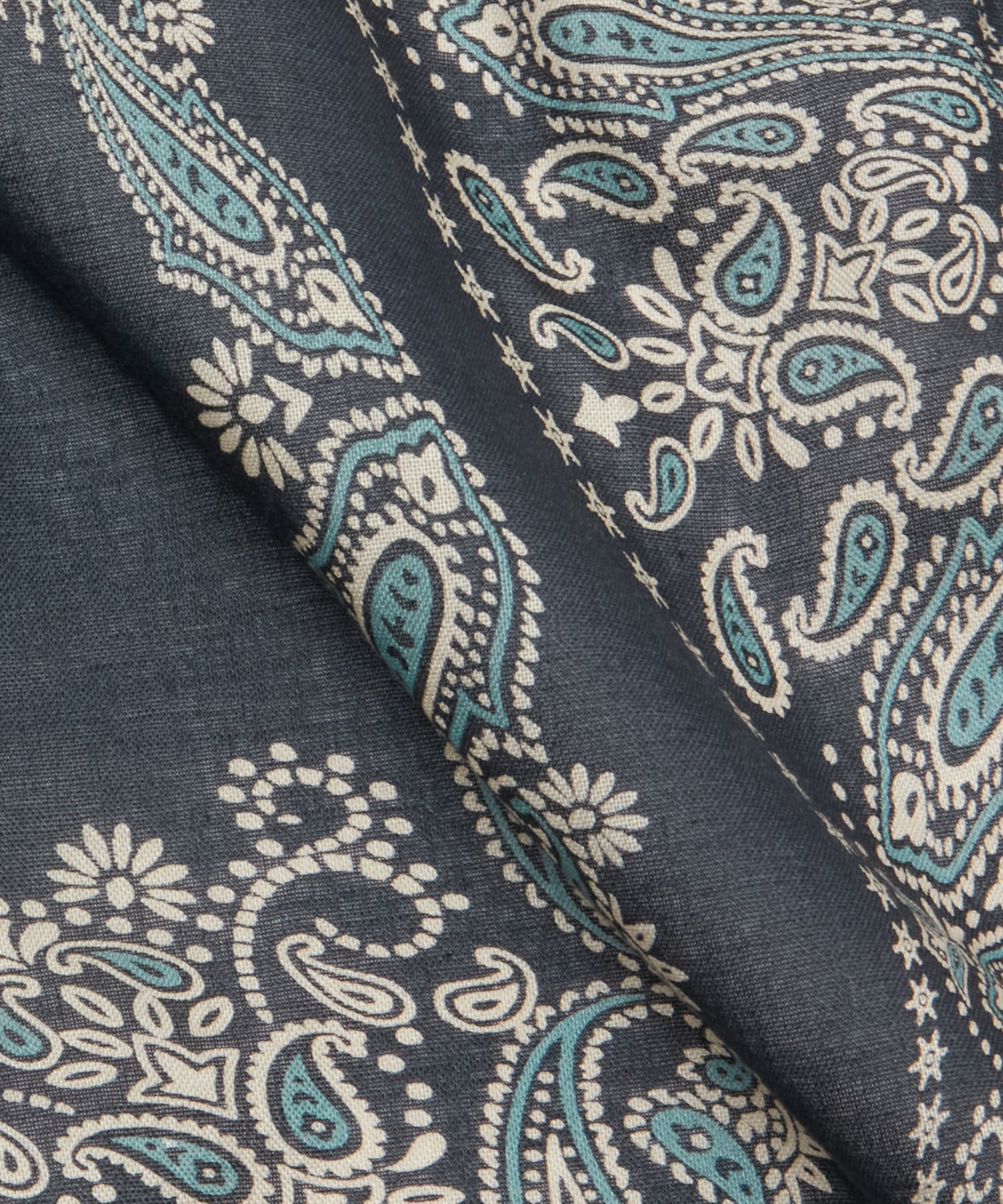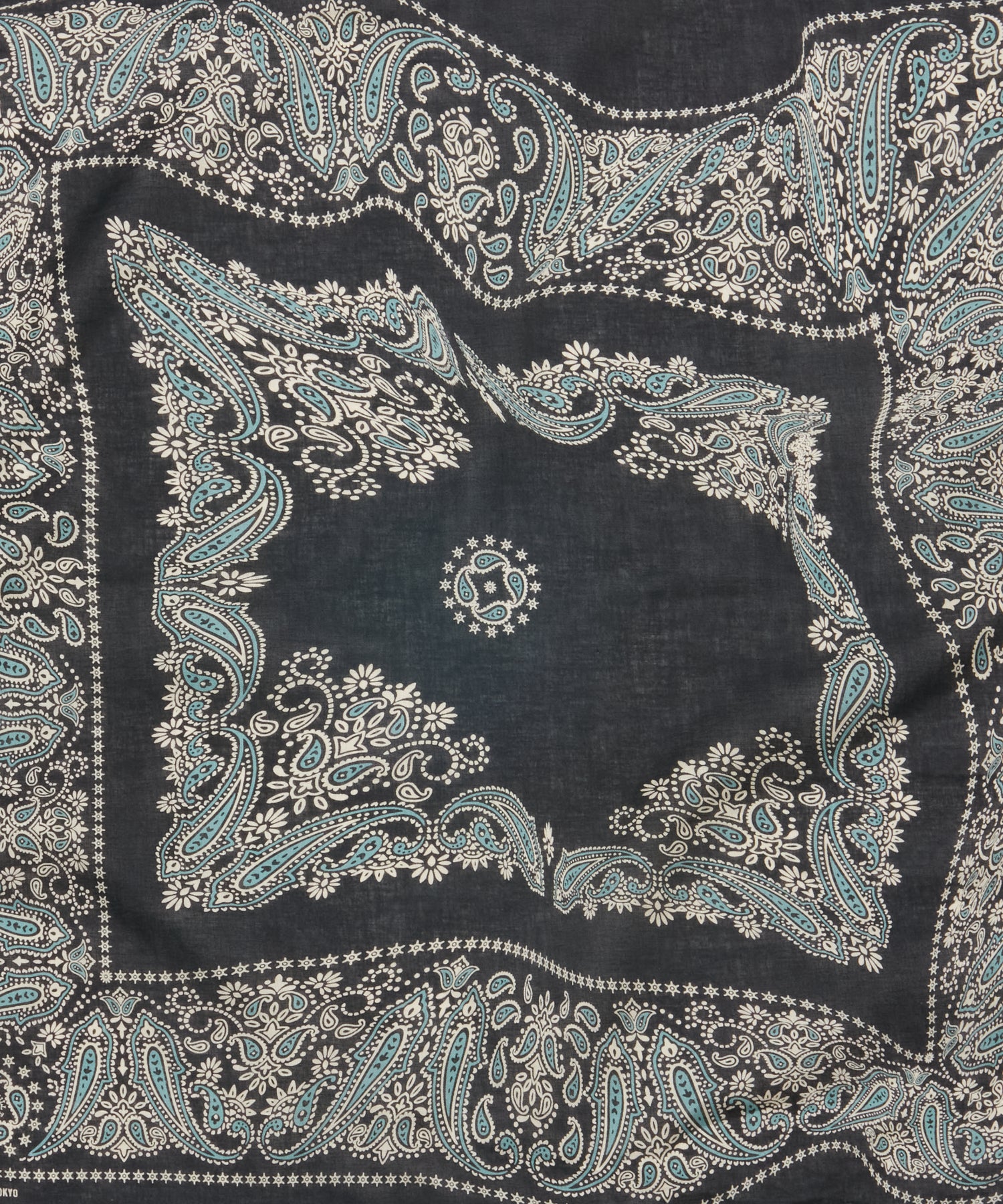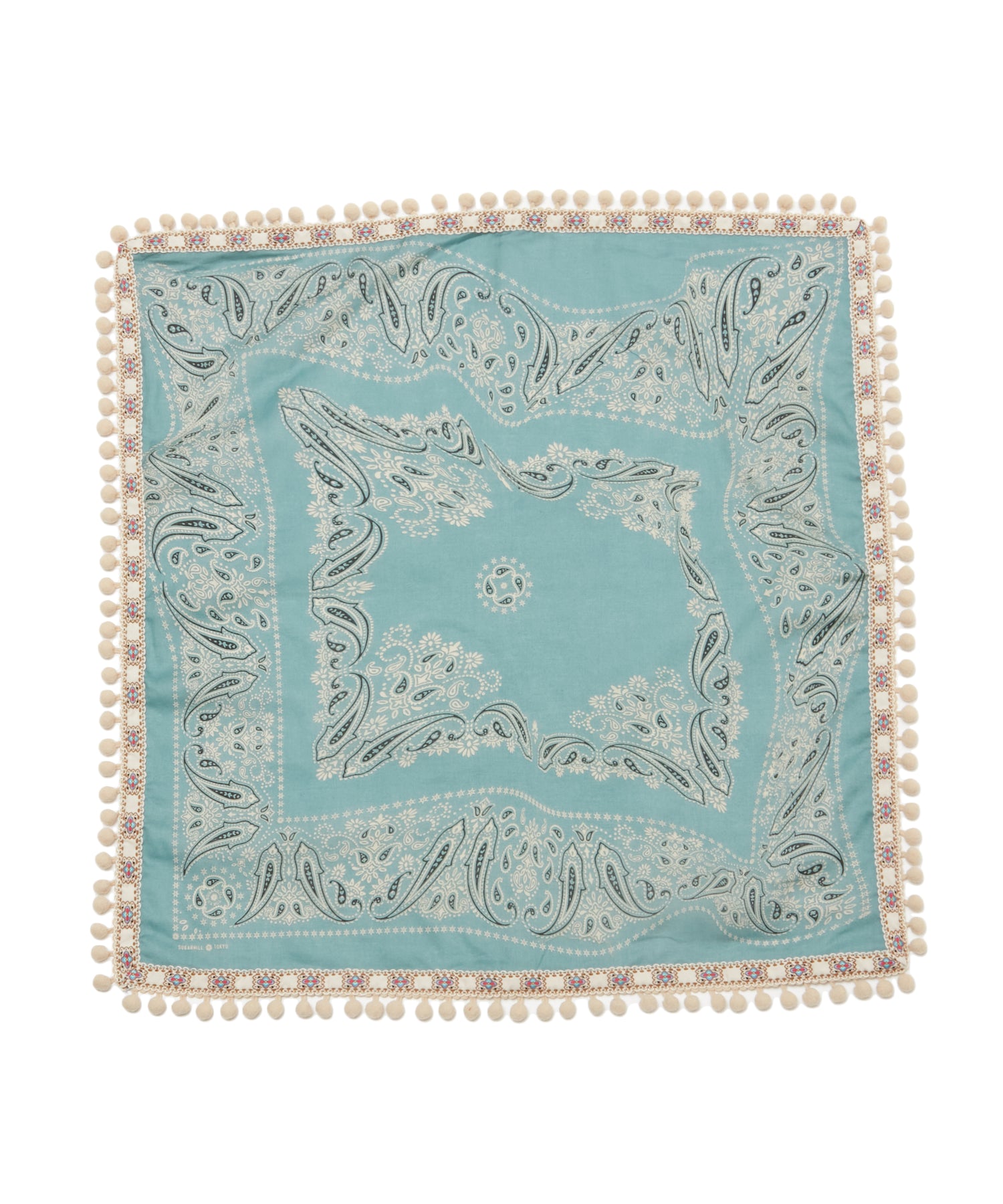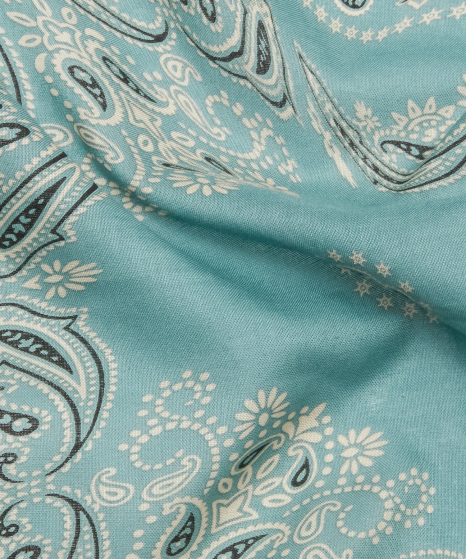 定番のバンダナに、動きのあるディテールをプラス。細かな柄のチロルテープを縁取りに用い、控えめながらも存在感を放ちます。首元に巻く、バッグに結ぶ、腰に垂らす。一枚で多彩な使い方が楽しめるアイテムです。