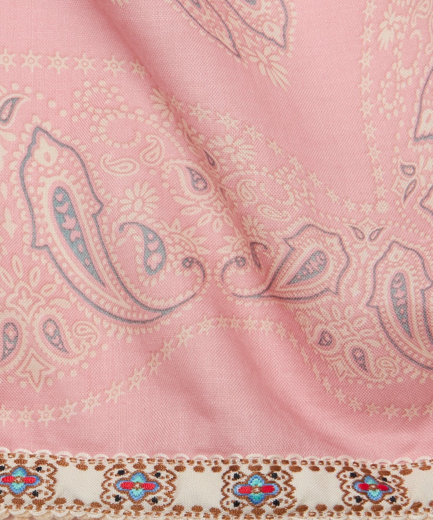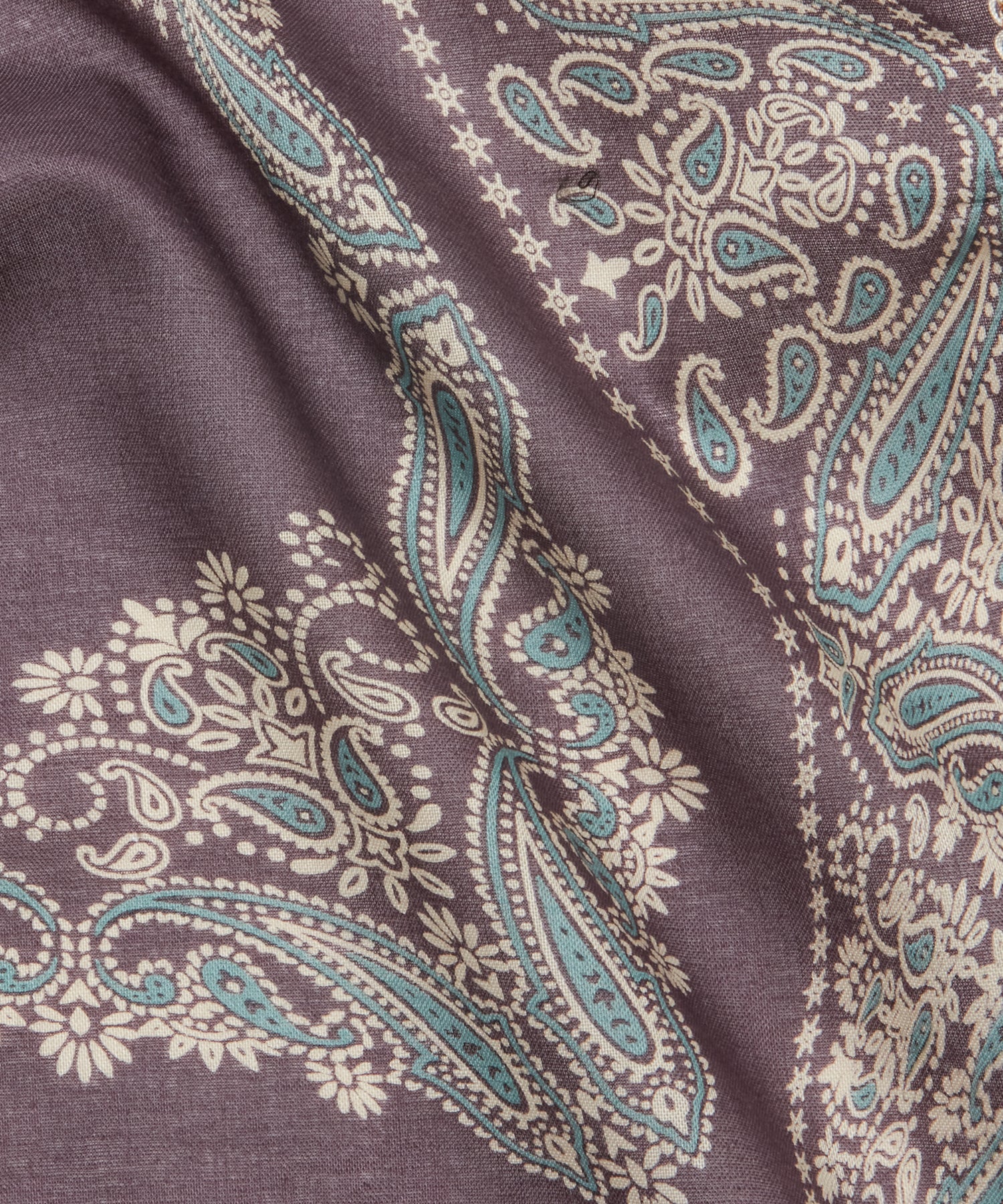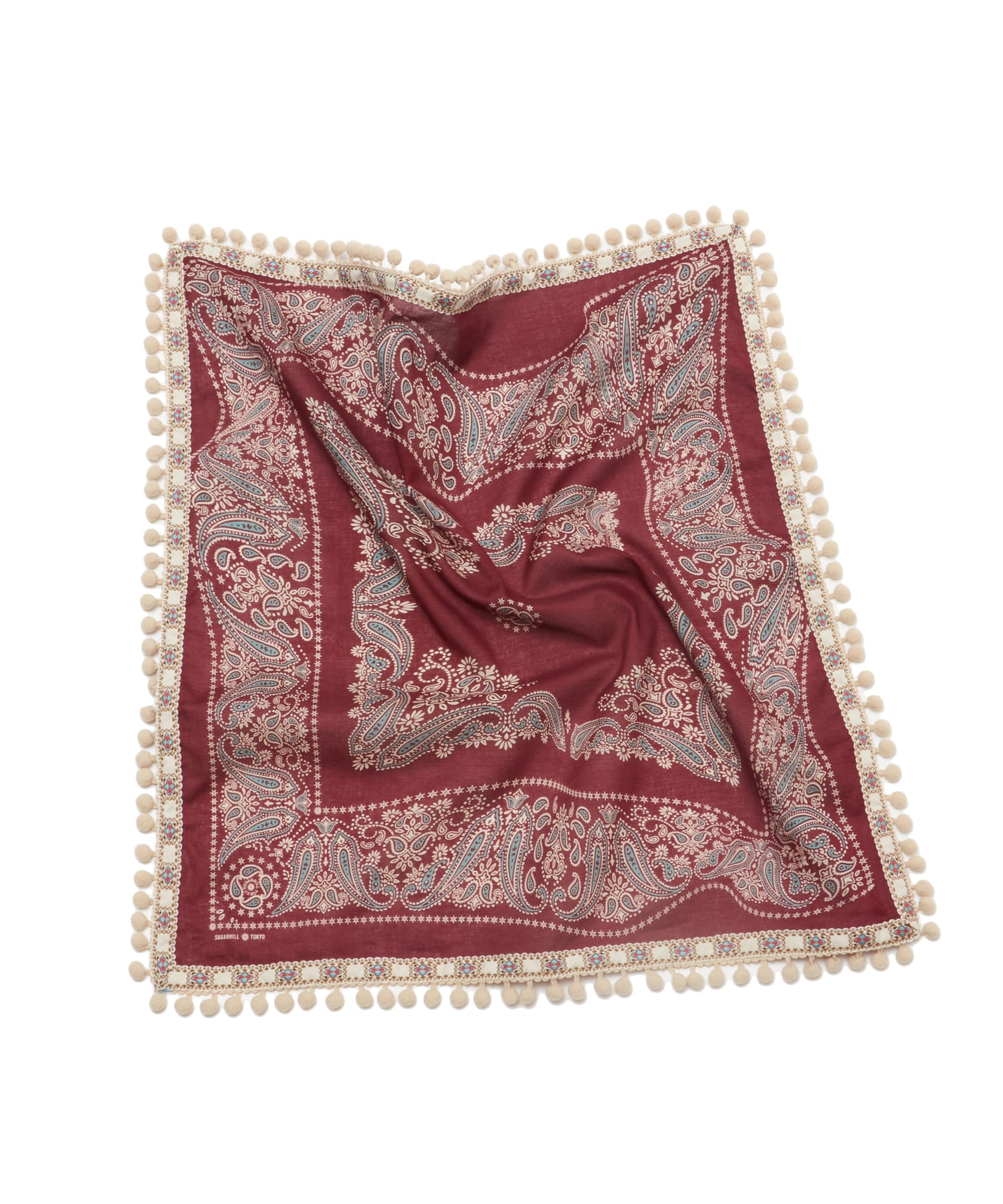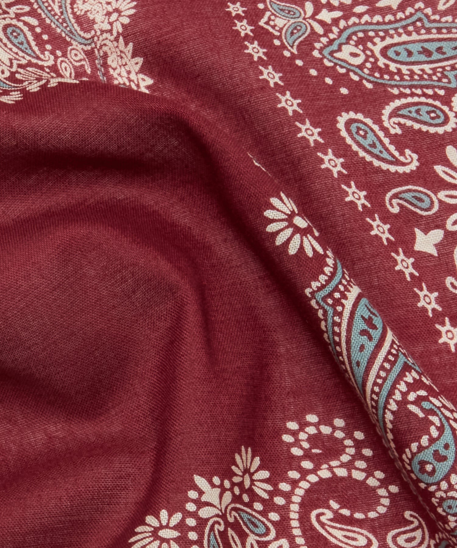 定番のバンダナに、動きのあるディテールをプラス。細かな柄のチロルテープを縁取りに用い、控えめながらも存在感を放ちます。首元に巻く、バッグに結ぶ、腰に垂らす。一枚で多彩な使い方が楽しめるアイテムです。
