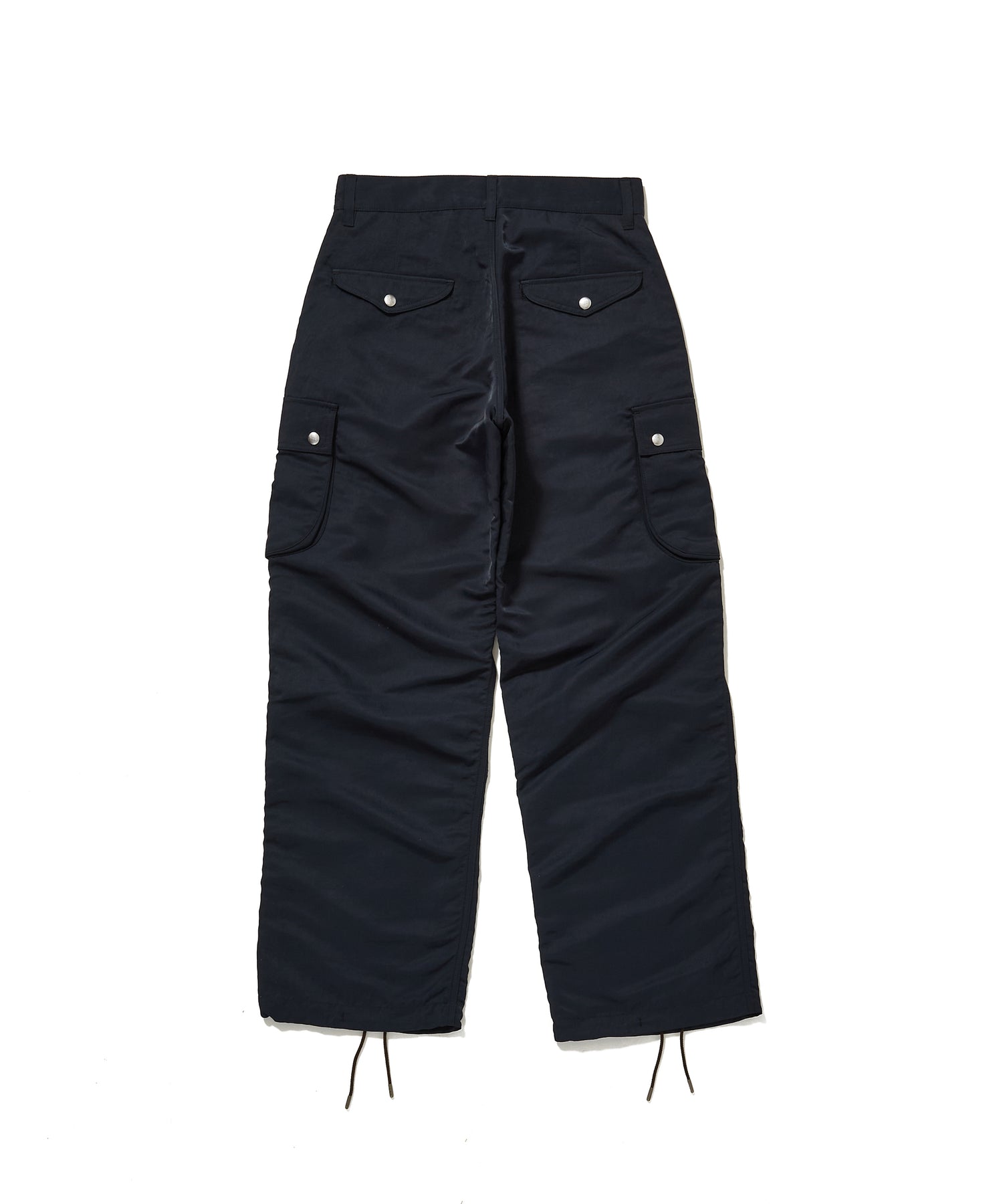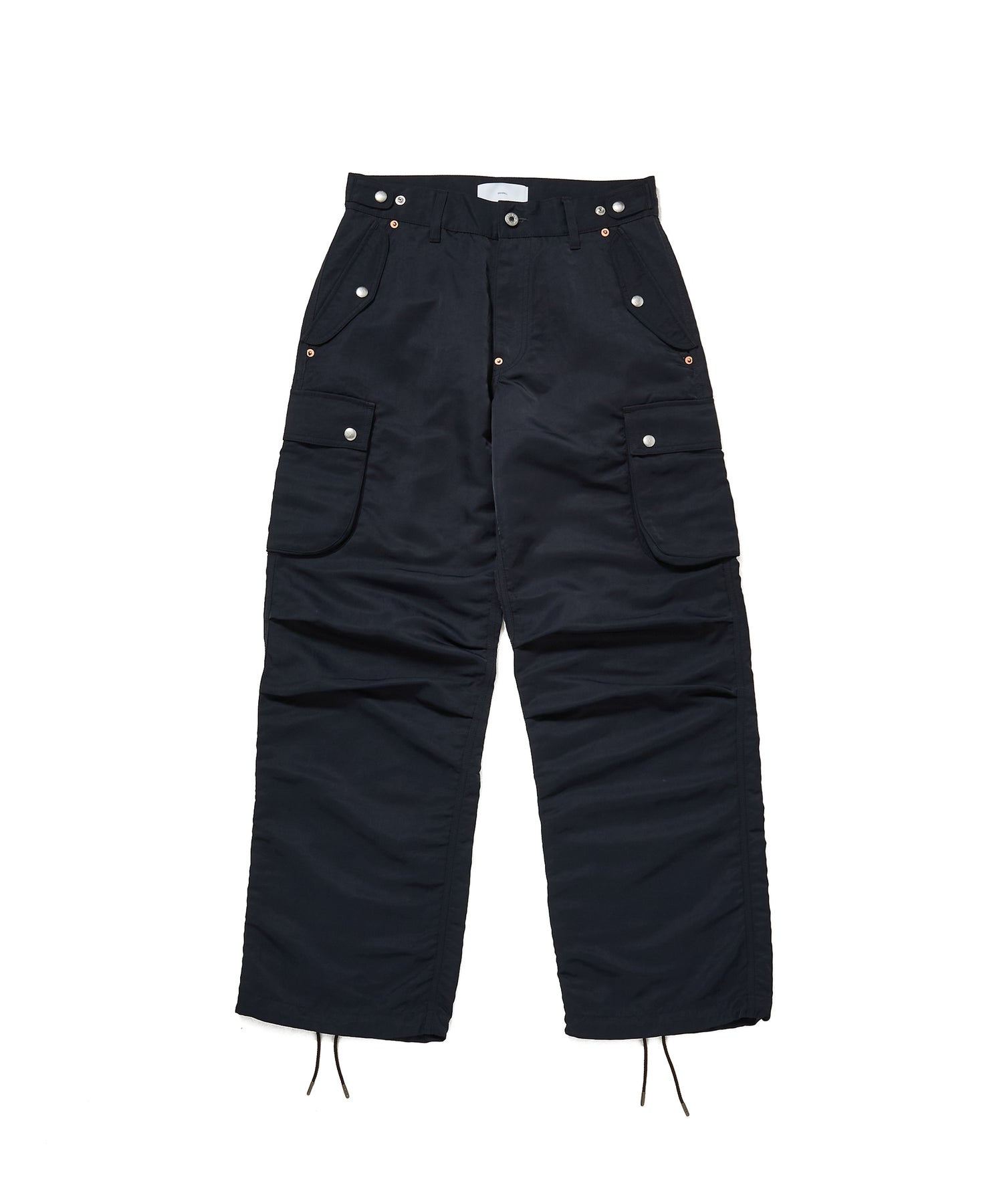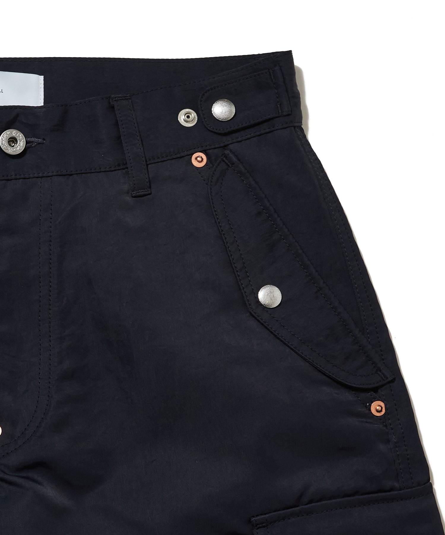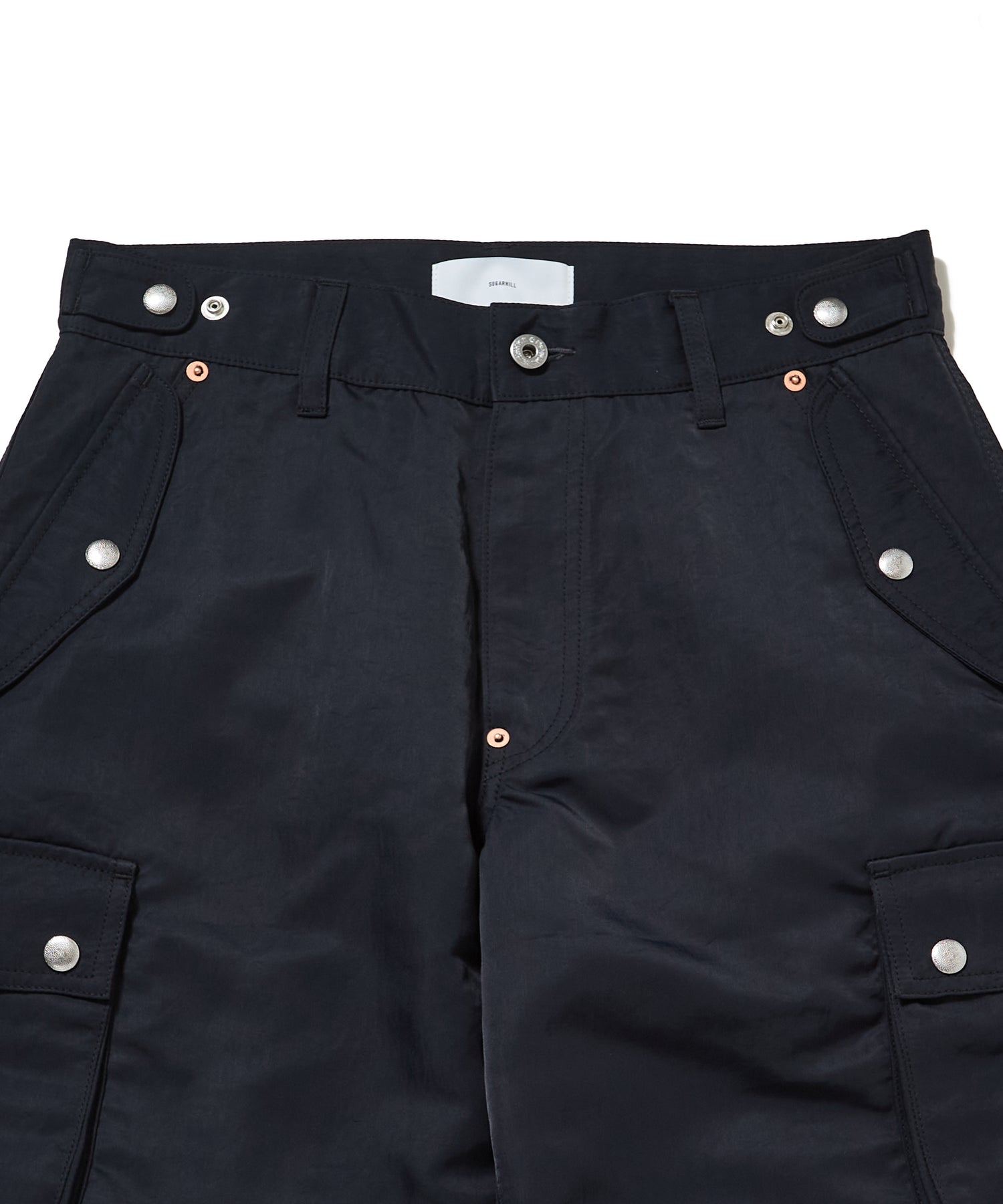 ナイロン素材を使用したカーゴパンツ。軽やかでシャープな印象に仕上げることで、カーゴ特有の野暮ったさを抑え、随所に配したオリジナルボタンがデザインポイント。実用性と存在感を両立。裾にはドローコードを備え、シルエットのアレンジも自在に楽しめます。