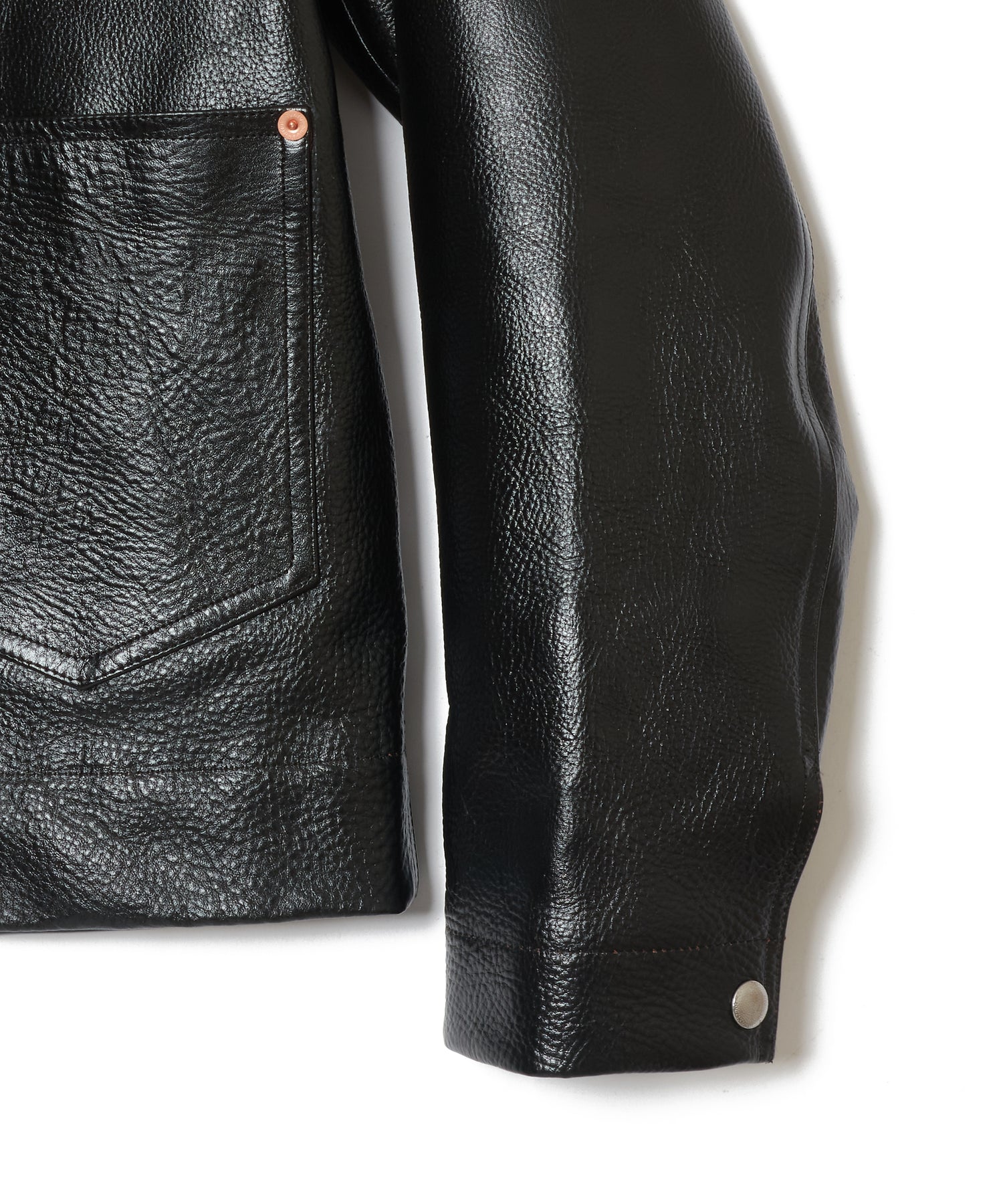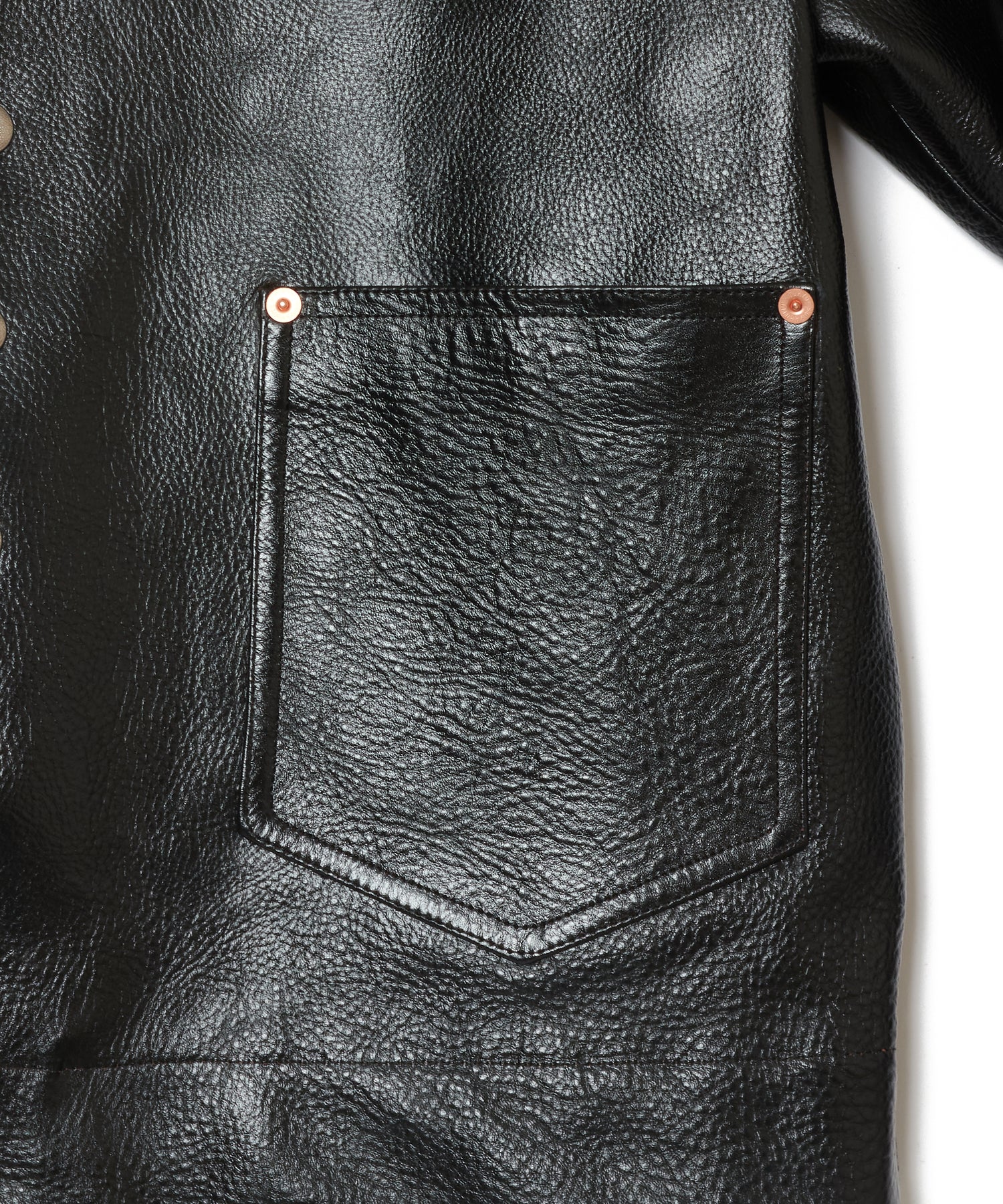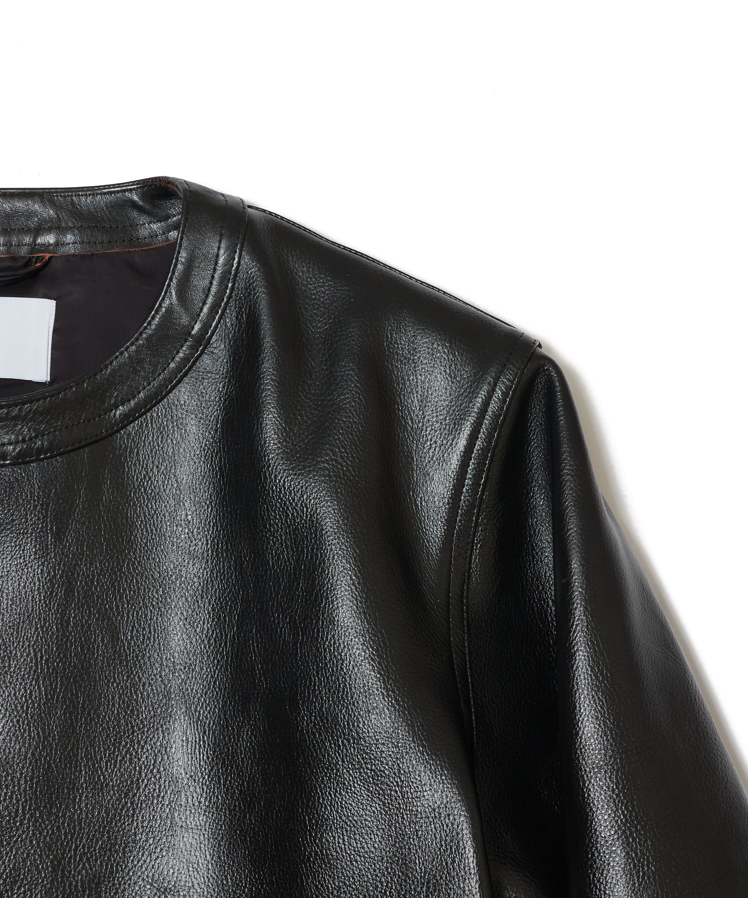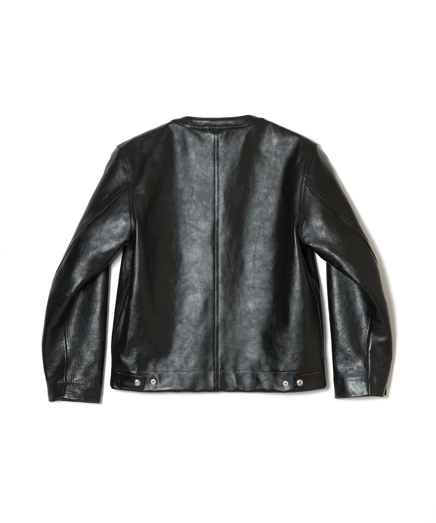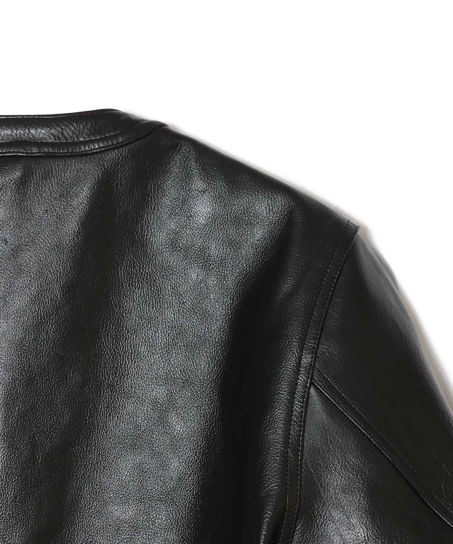 しなやかさと程よい厚みを兼ね備えた素材感で、着用時の馴染みの良さが魅力。フロントはスナップボタン仕様で、ミニマルな印象の中に無骨さを感じさせるデザイン。大きめに配置されたフロントポケットがアクセントとなり、実用性と存在感を両立しています。ノーカラーのすっきりとした首元とやや短めの着丈バランスにより、インナー次第で幅広いスタイリングが可能。着込むほどにレザー特有の経年変化も楽しめる、長く愛用できる一着。