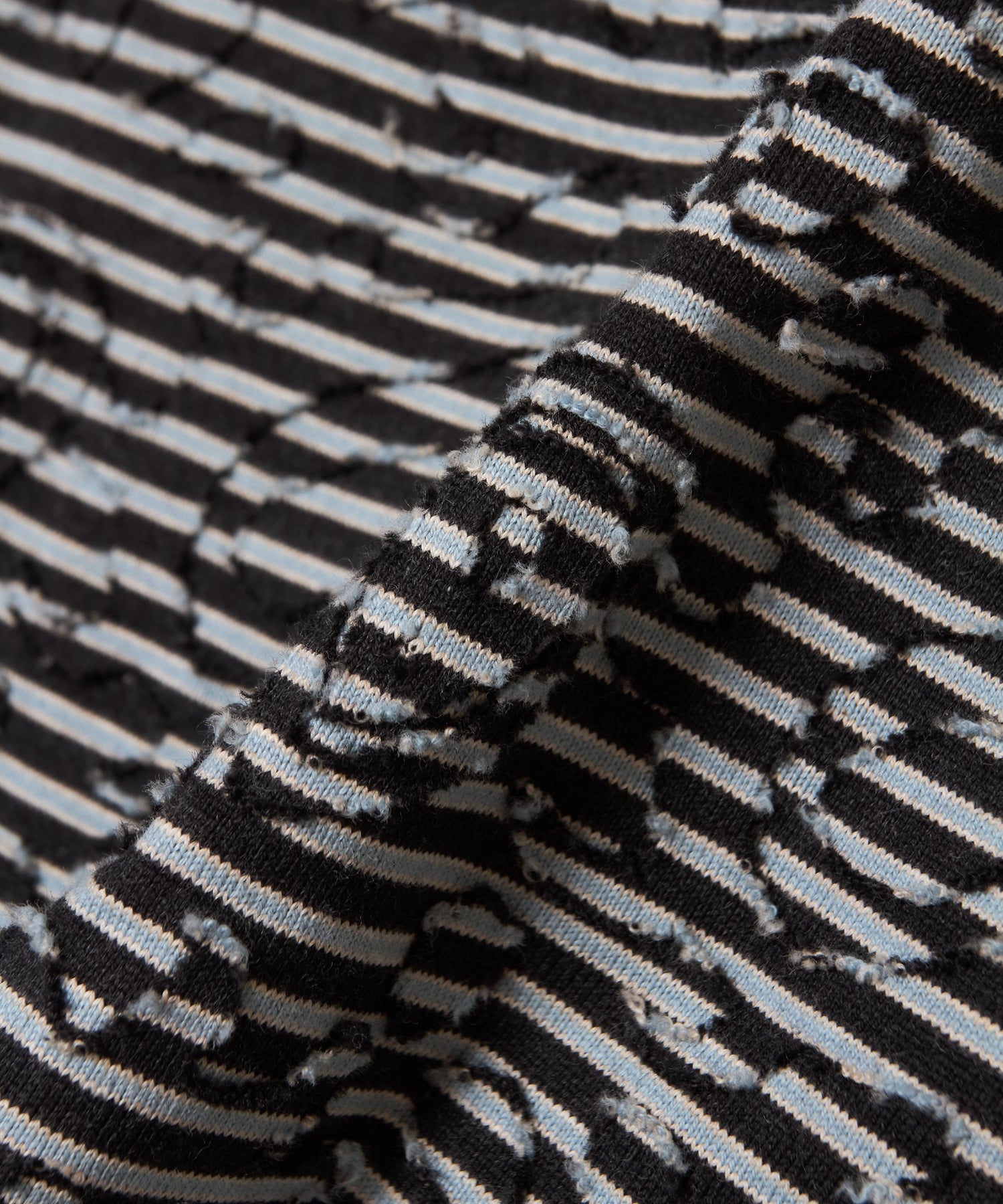 These denim pants are made of black denim with vertical black and horizontal white and have been chemically washed.